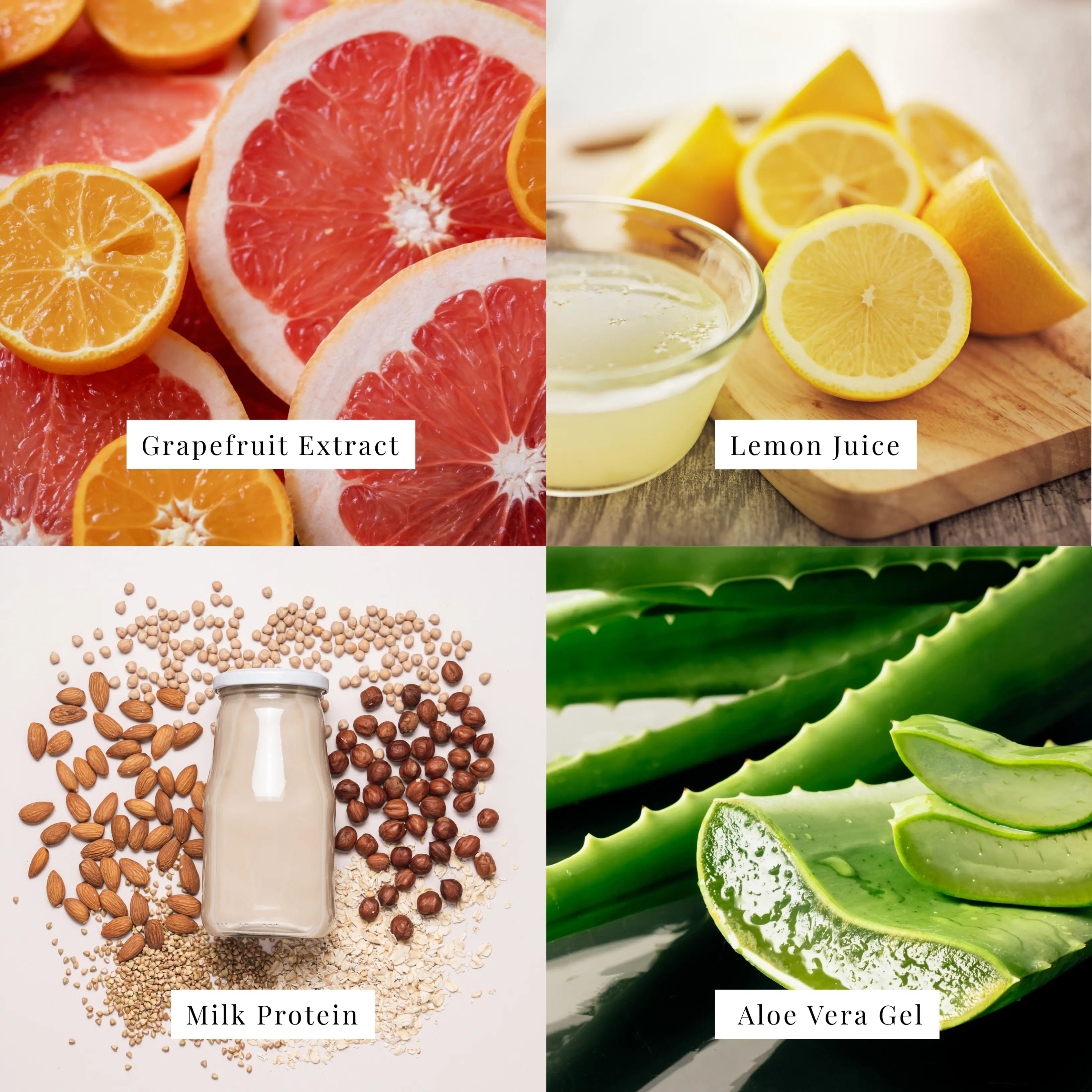Grapefruit Extract: Rich in antioxidants, grapefruit neutralizes free radicals to fight signs of premature aging, helps lighten skin tone, and promotes a brighter, youthful complexion.