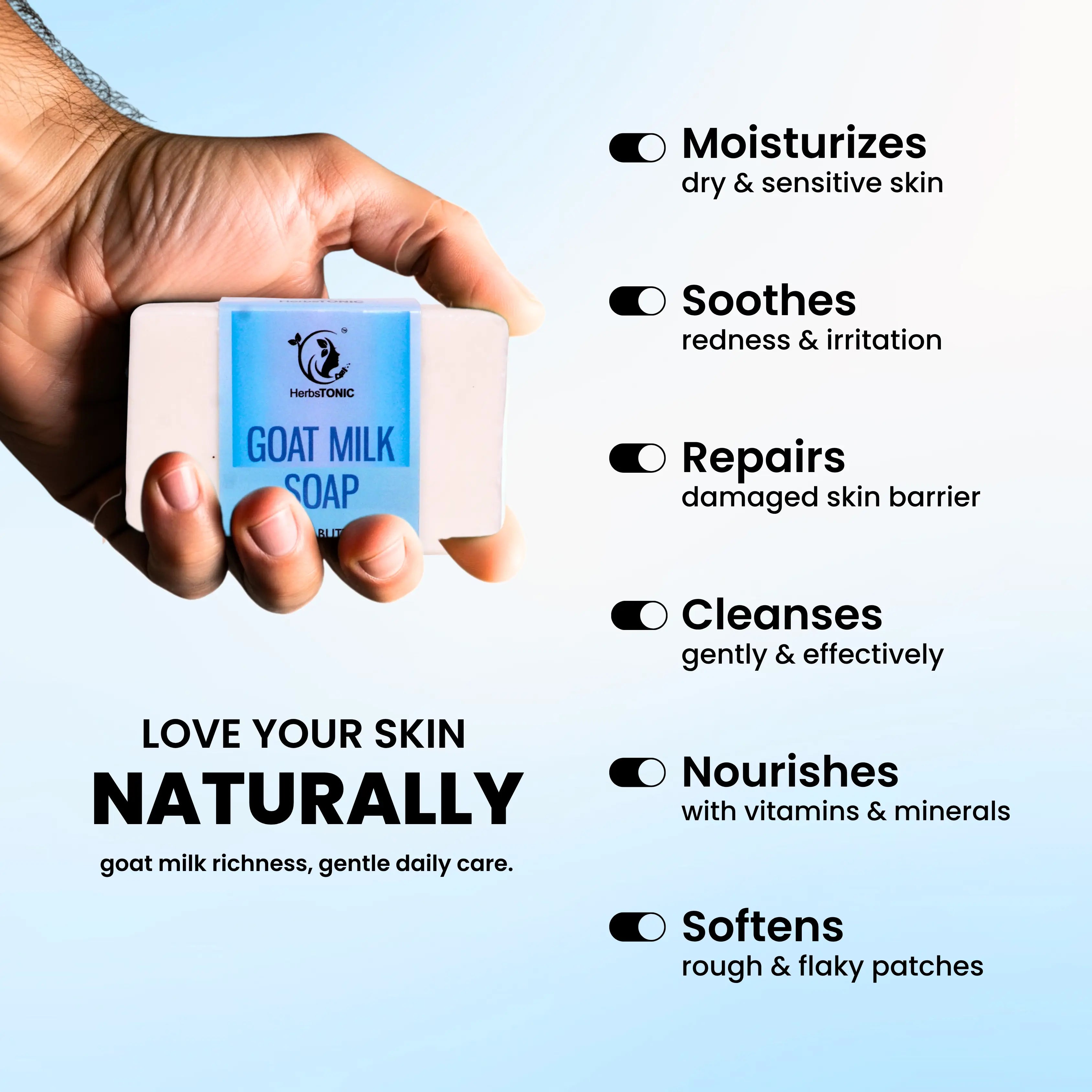 Indulge in HerbsTonic Goat Milk Soap to reveal the healthiest version of your skin. Suitable for daily use, this soap is a perfect blend of natural and herbal ingredients, designed to bring you closer to nature with every wash. Embrace the confidence of radiant, moisturized skin – because your skin deserves nothing but the best!